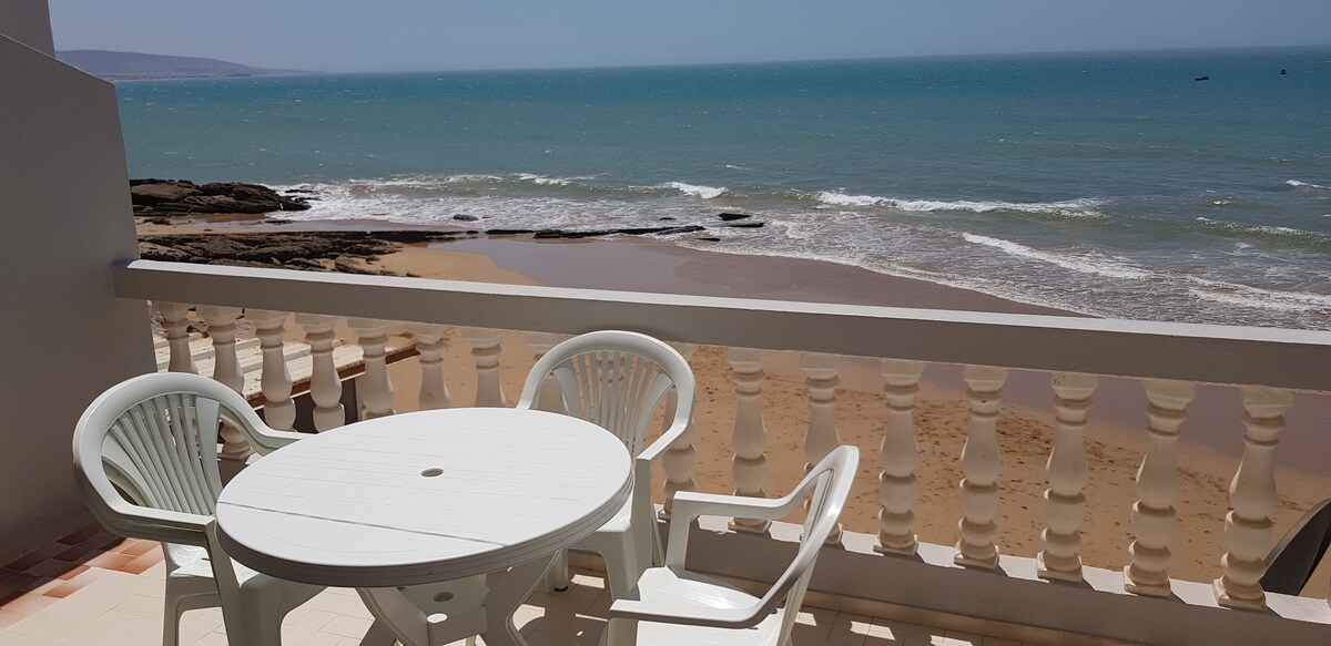 This apartment is located directly on the beach of Taghazout and is 70 square meters in size. It has one bedroom with a double bed, one bedroom with two single beds(bed linen is provided) one bathroom with Shower, a kitchen equipped with electric appliances(fridge-freezer, Microwave, kettle, electric grill, coffee maker), as well as the complete dishes. The living room is equipped in a Moroccan style and thus also offers sleeping options for two to three people. There is also a CD player and a video device in the living room with digital programs(all European programs). In the hallway is a large closet with enough storage space. The apartment has a large balcony with beautiful views of the sea.